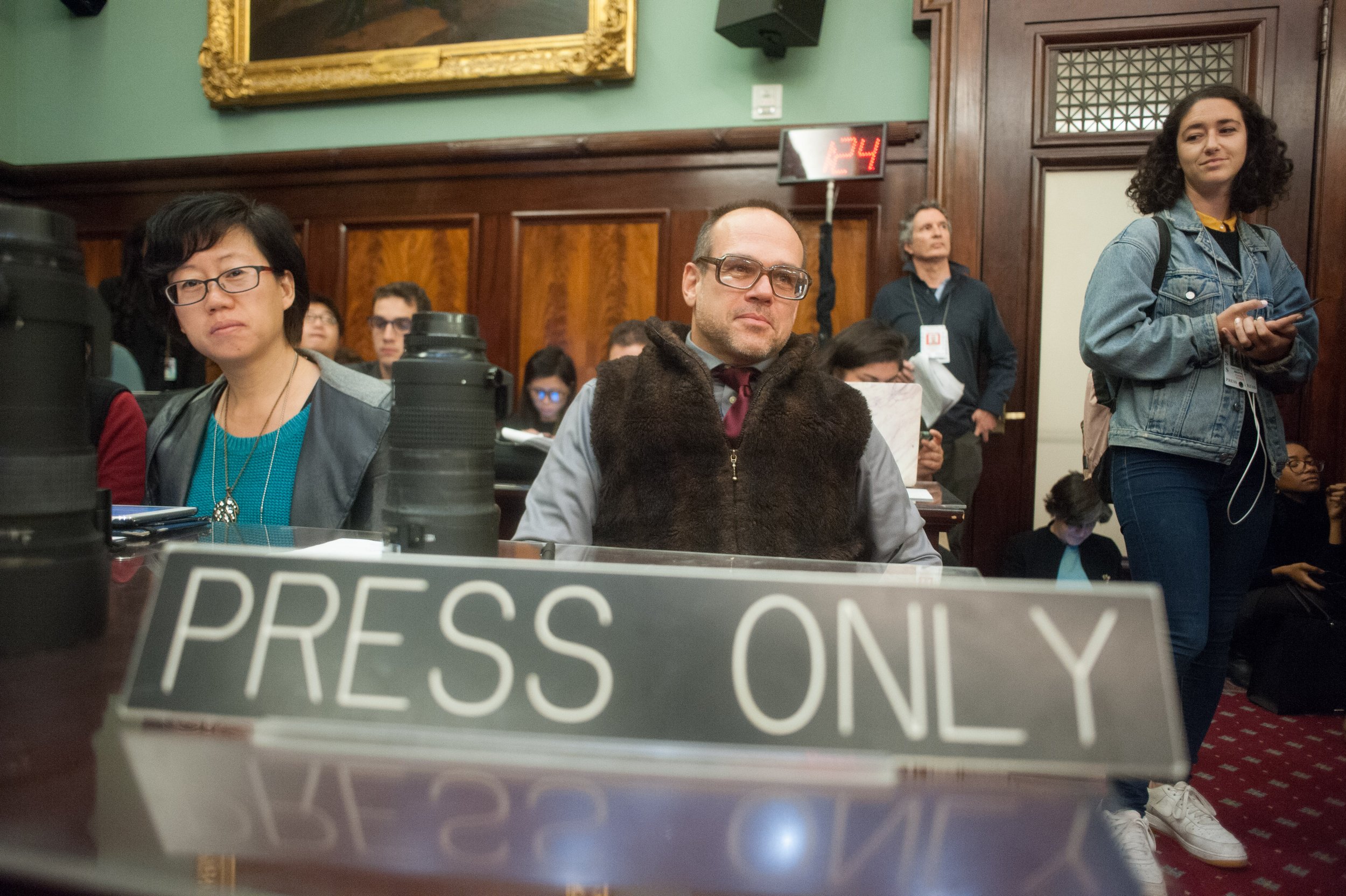 JB Nicholas inside the New York City Council chamber when the Council voted to close Rikers Island, Oct. 17, 2019. Photo credit: William Alatriste.