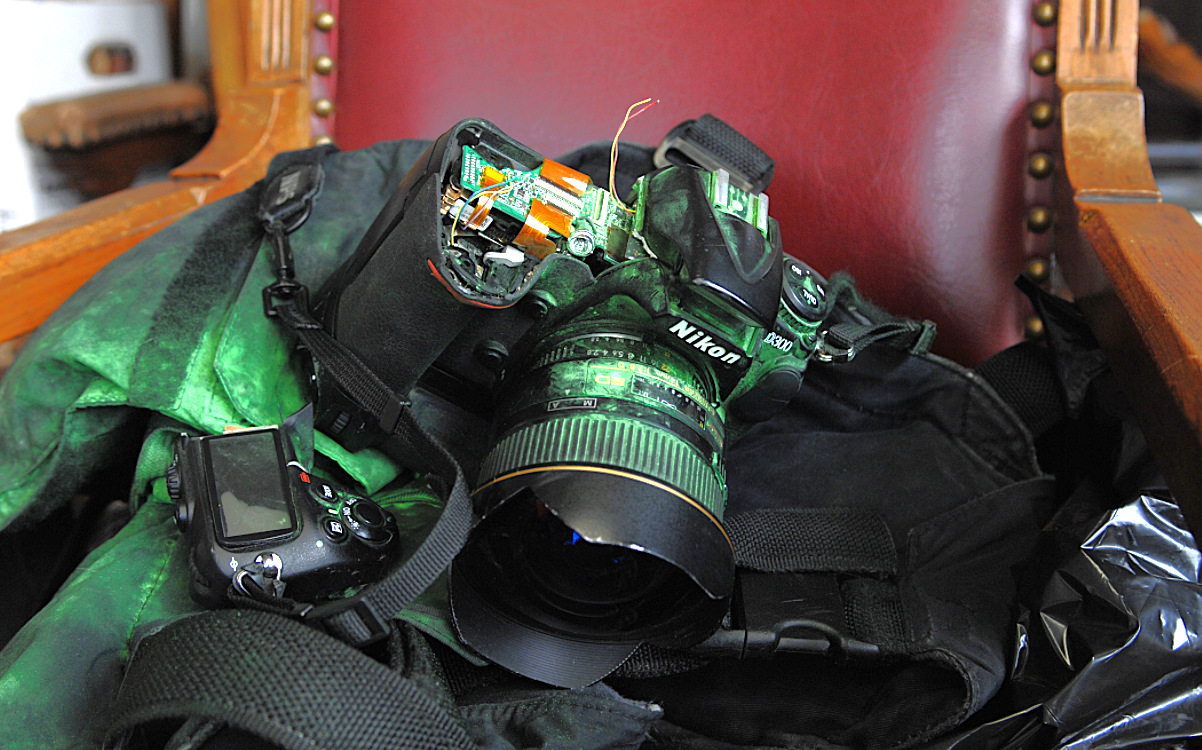 My camera after being shot out of my hands by militarized and federalized Minnesota police during the 2008 Republican National Convention in St. Paul, Sept. 4, 2008. .Photo credit: JB Nicholas.
