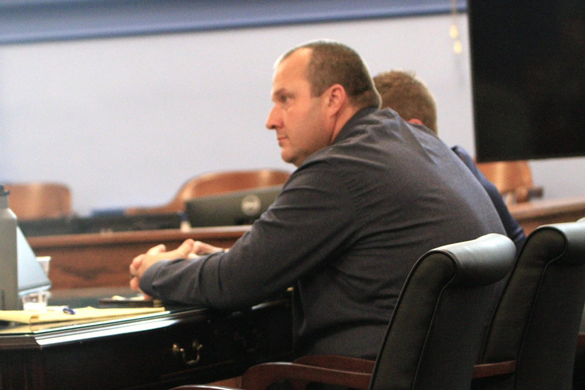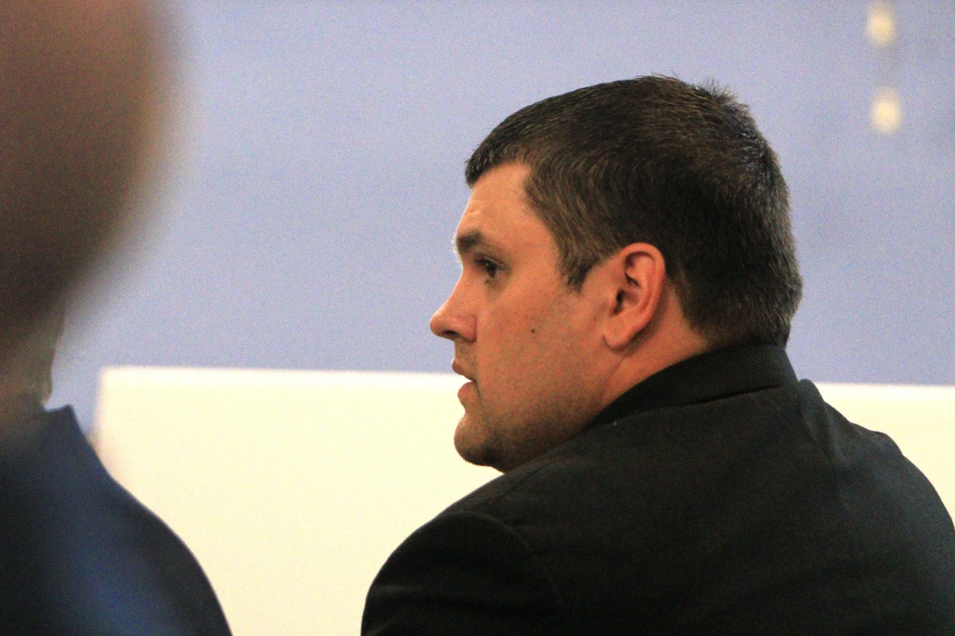 David Kinglsey watched from the defense table as his lawyer gives their opening statement in his murder trial in Oneida County court in Utica, New York, Oct. 7, 2025. Photo credit: JB Nicholas..