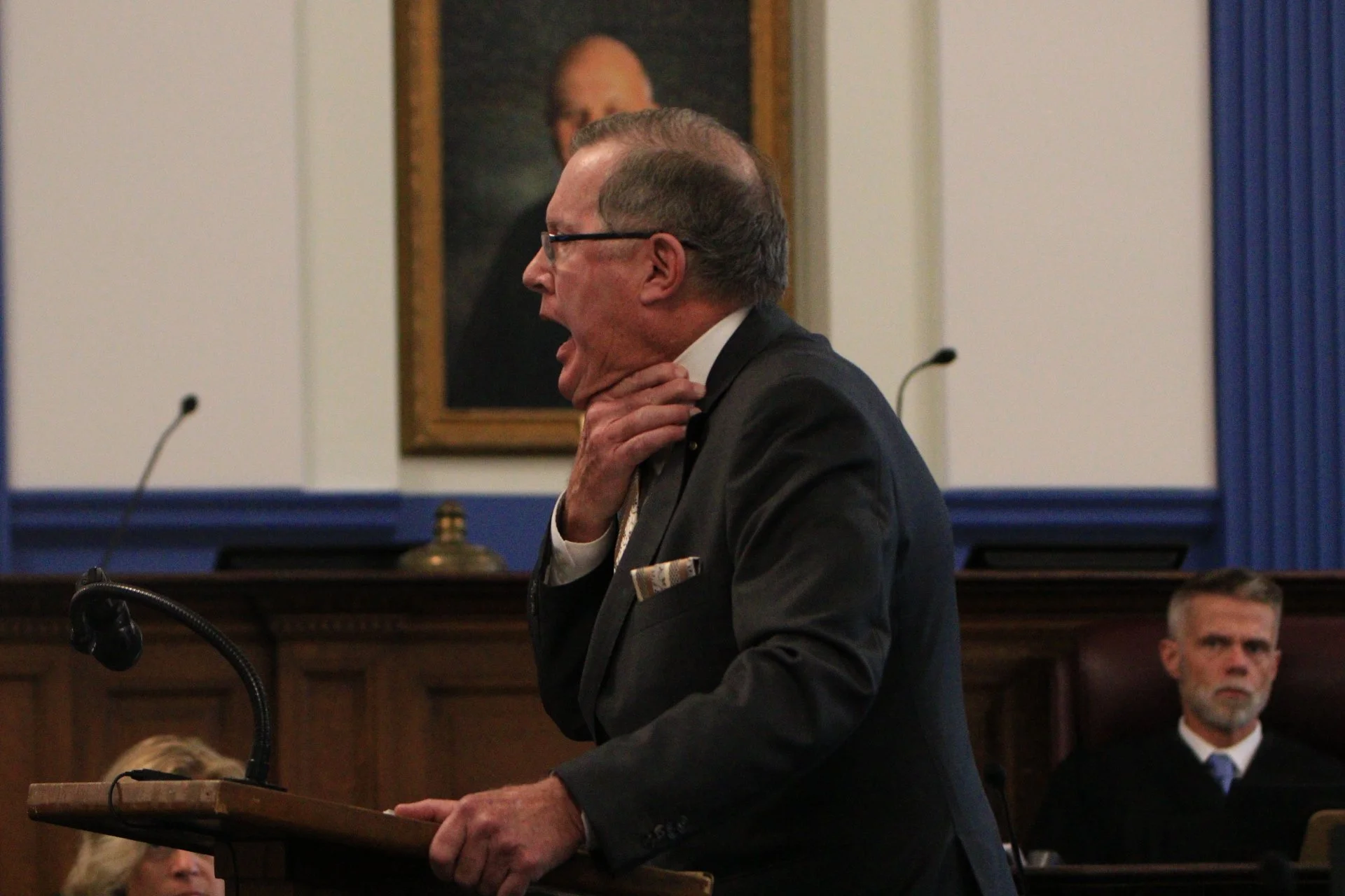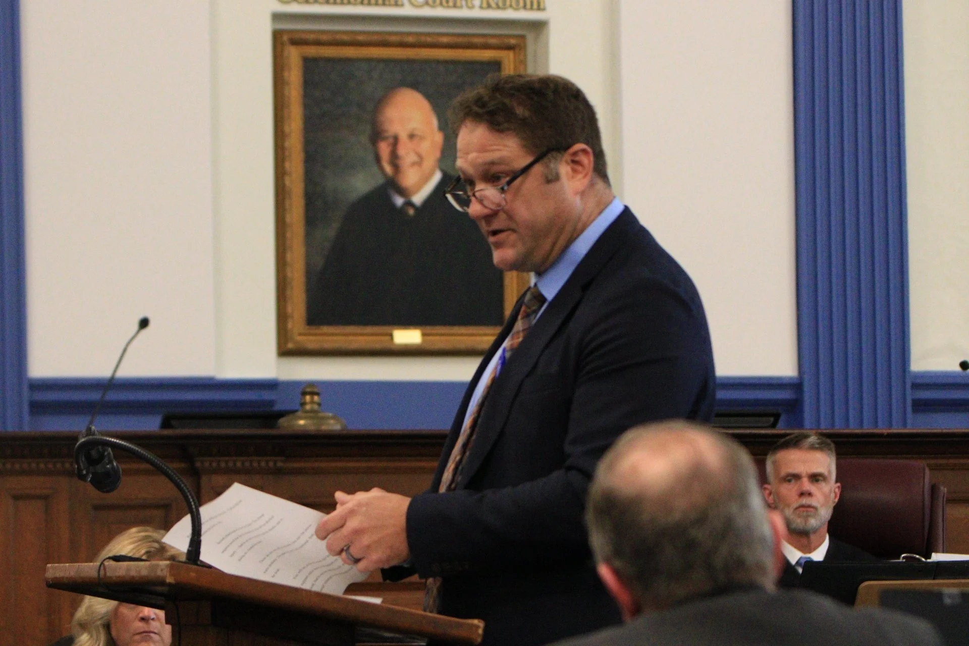 Luke Nebush, Chief Trial Counsel for the Oneida County Public Defenders, represents former guard David Kingsley. Here he gives their opening argument to the jury as Oneida County judge Robert Bauer looks on. Photo credit: JB Nicholas.