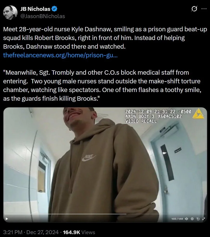 Dashnaw was a nurse at Marcy working inside the infirmary when Brooks was killed. Body-camera video captured Dashnaw smiling while Brooks was killed. He was ordered by guards to stay outside the treatment room where Brooks was killed, called the "emergency room," and Dashnaw silently complied.