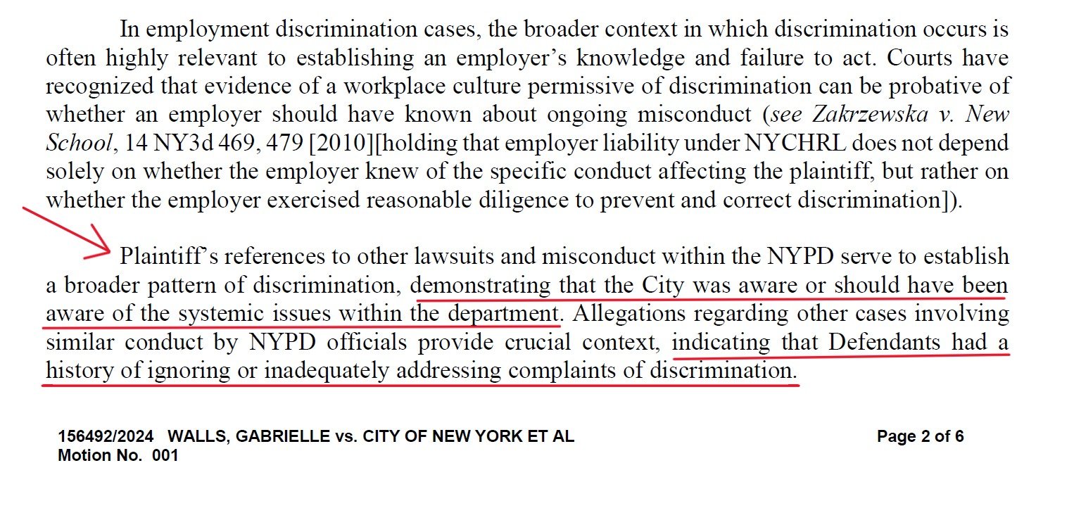 On Mar. 3, State Supreme Court Justice Hasa N. Kingo denied the City's request to dismiss the complaint. Justice Kingo ruled the allegations "serve to establish a broader pattern of discrimination, demonstrating that the City was aware or should have been aware of the systemic issues within the department."