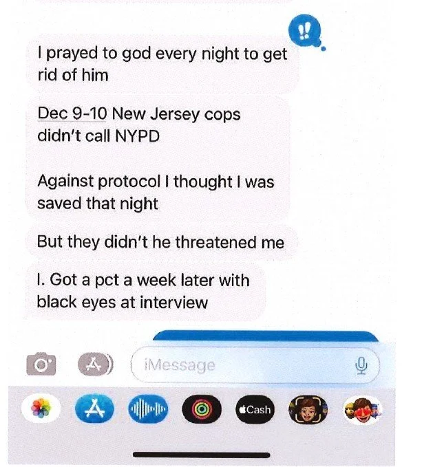 Text message by female NYPD captain to a friend after she was almost choked to death by NYPD Captain Hariton Marachilian. A month after the attack, both of them were given precincts to command by the NYPD. She says she went to the interview for the command still bearing two black eyes from the attack. Photo credit: unknown, via New Jersey court records.