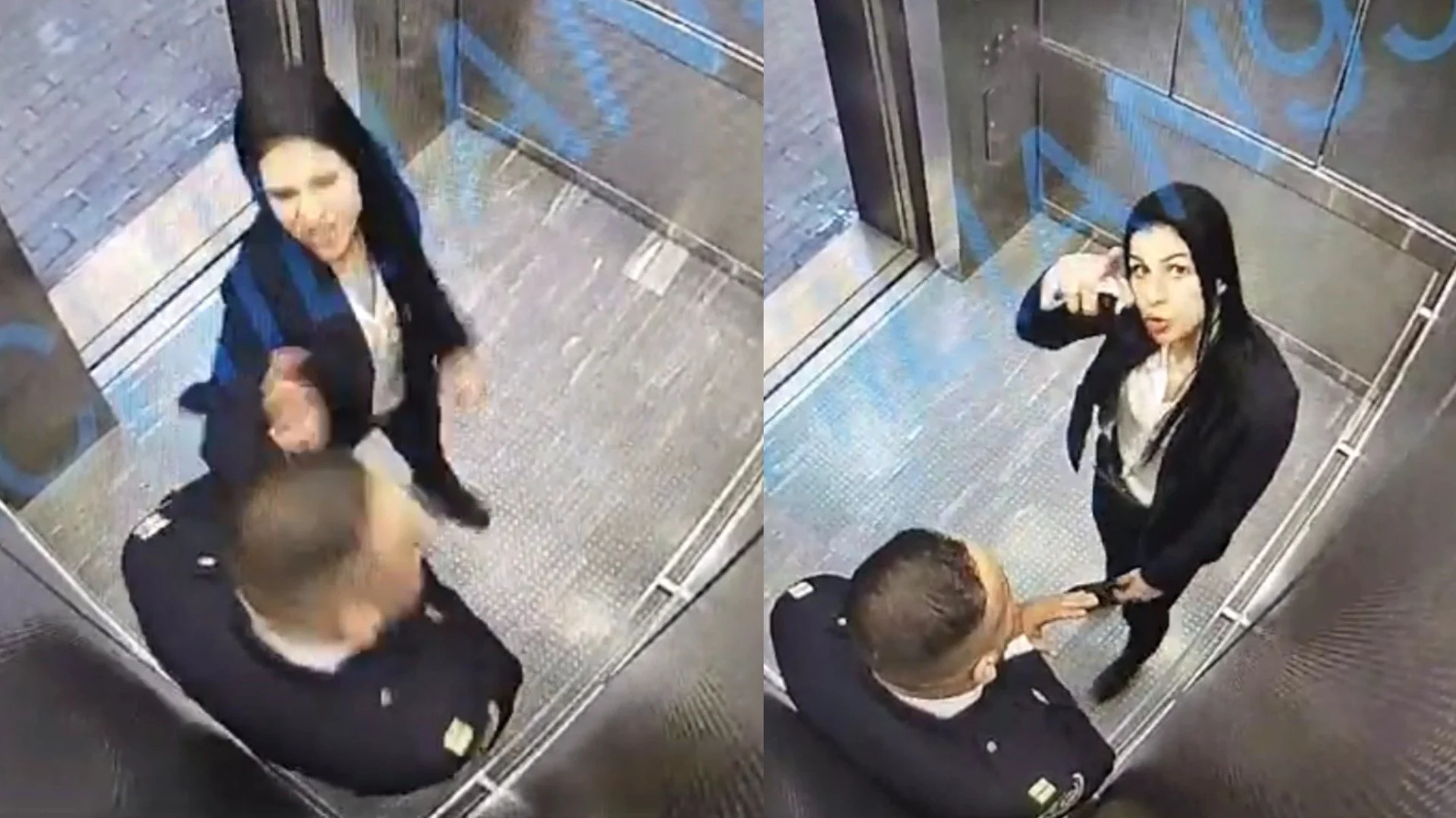 The video, from a surveillance camera inside an elevator at NYPD headquarters, captures a female NYPD captain punching fellow NYPD captain Hariton Marachilian in the face then pointing to the camera.