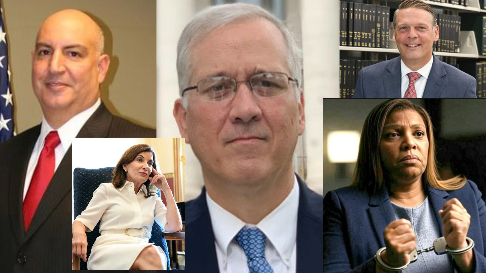 Franklin County judge John T. Ellis (left), Sullivan County judge James R. Farrell (center) and Daniel C. Lynch (top right) all ruled against releasing the disciplinary records of the prison guards who murdered Robert Brooks, in lawsuits defended tooth-and-nail by Attorney General Letitia James (lower right). Gov. Kathy Hochul vetoed a proposed new law to strengthen New York’s broken Freedom of Information Law. Photo credits: unknown, James is AI-generated after her arrest on federal felony charges in Virginia.