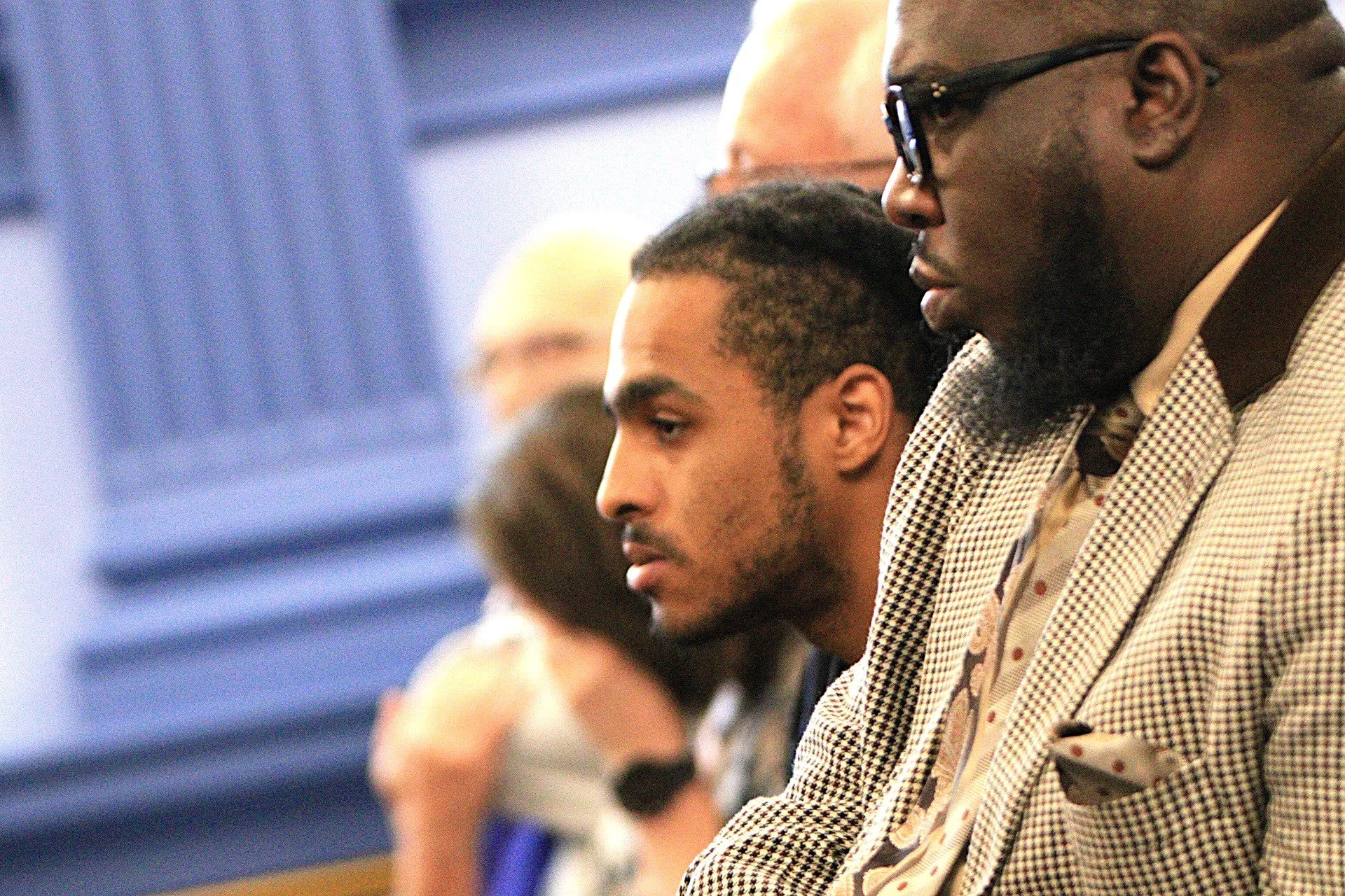 Robert Brooks jr. listening to attorneys for the three prison guards accused of murdering his father at the Marcy Correctional Facility on Dec. 9., 2024 make closing arguments in their trial in Oneida County Court on Oct. 15, 2025. Rev. Kevin McCall sits next to him. Photo credit: JB Nicholas.